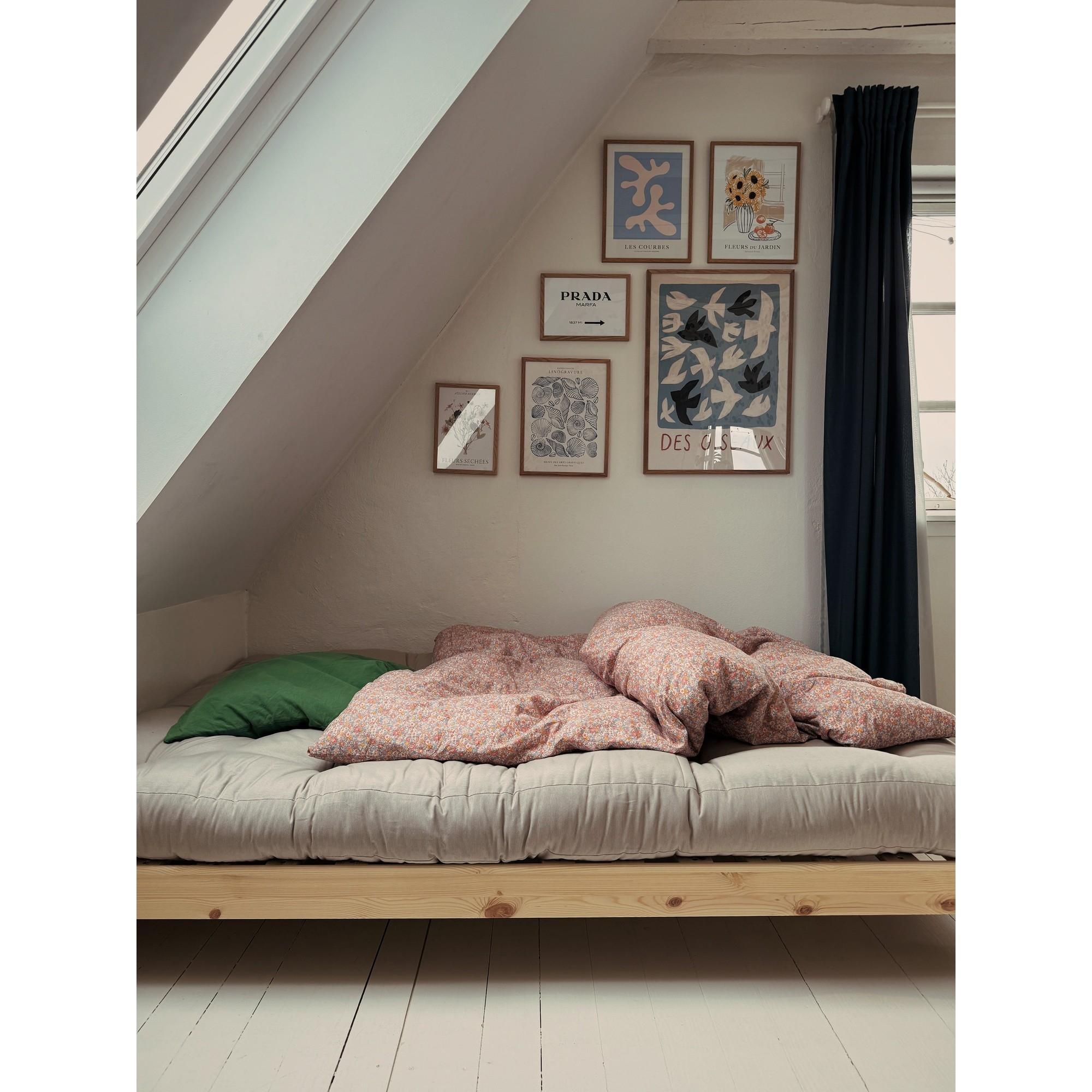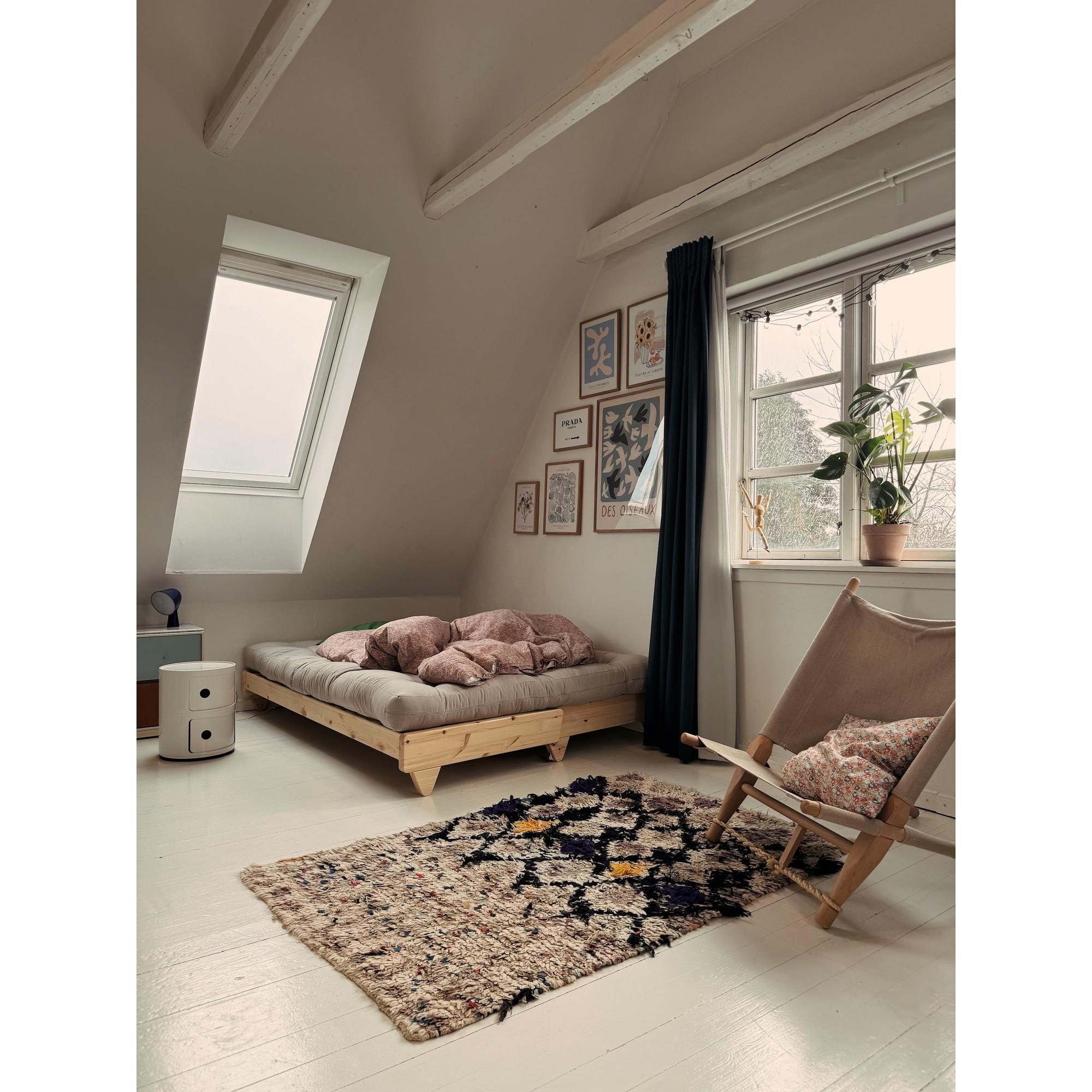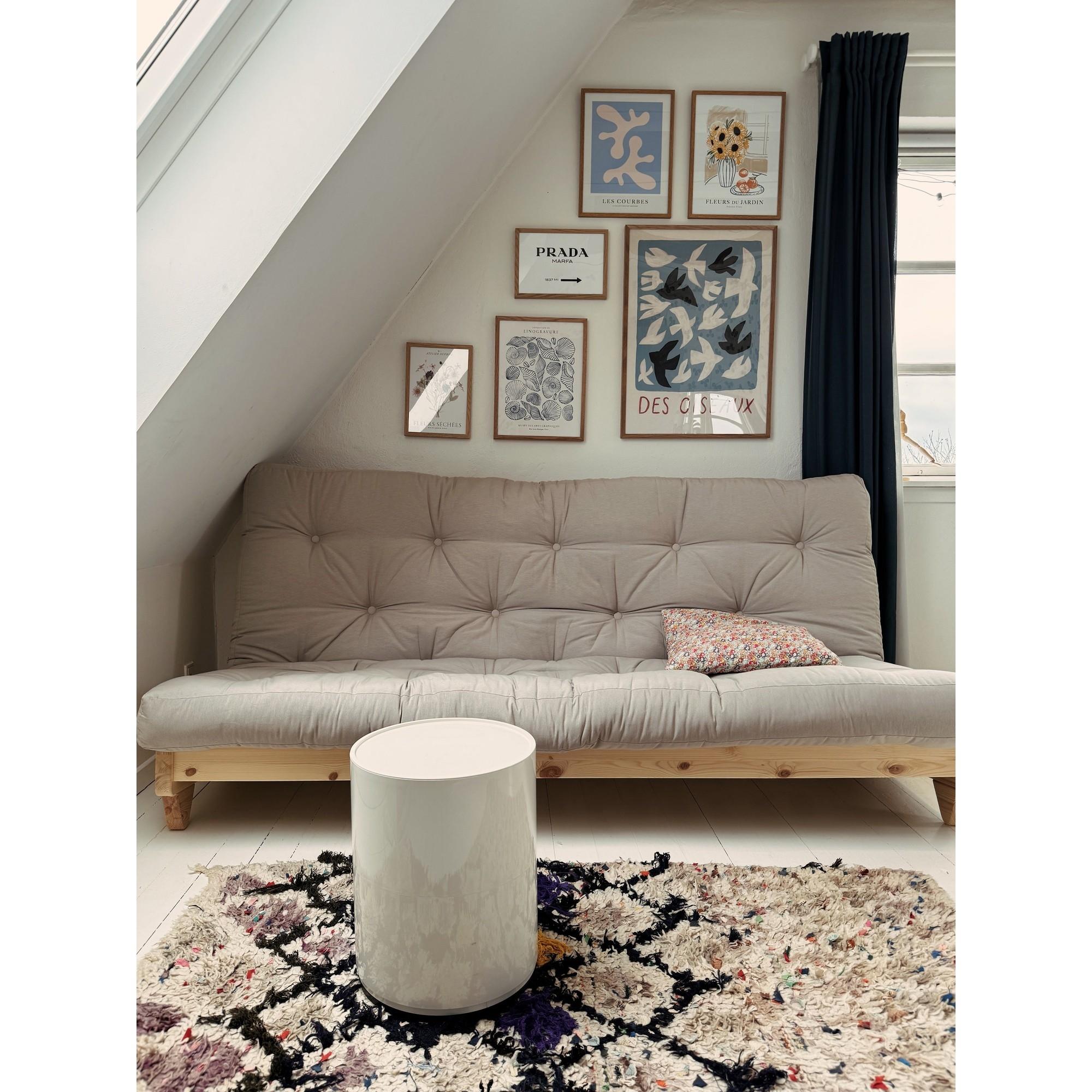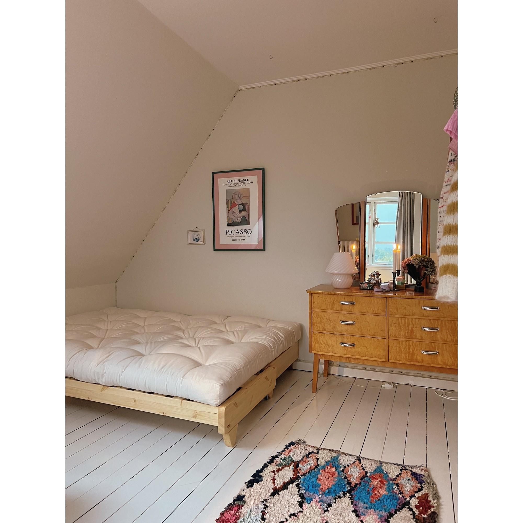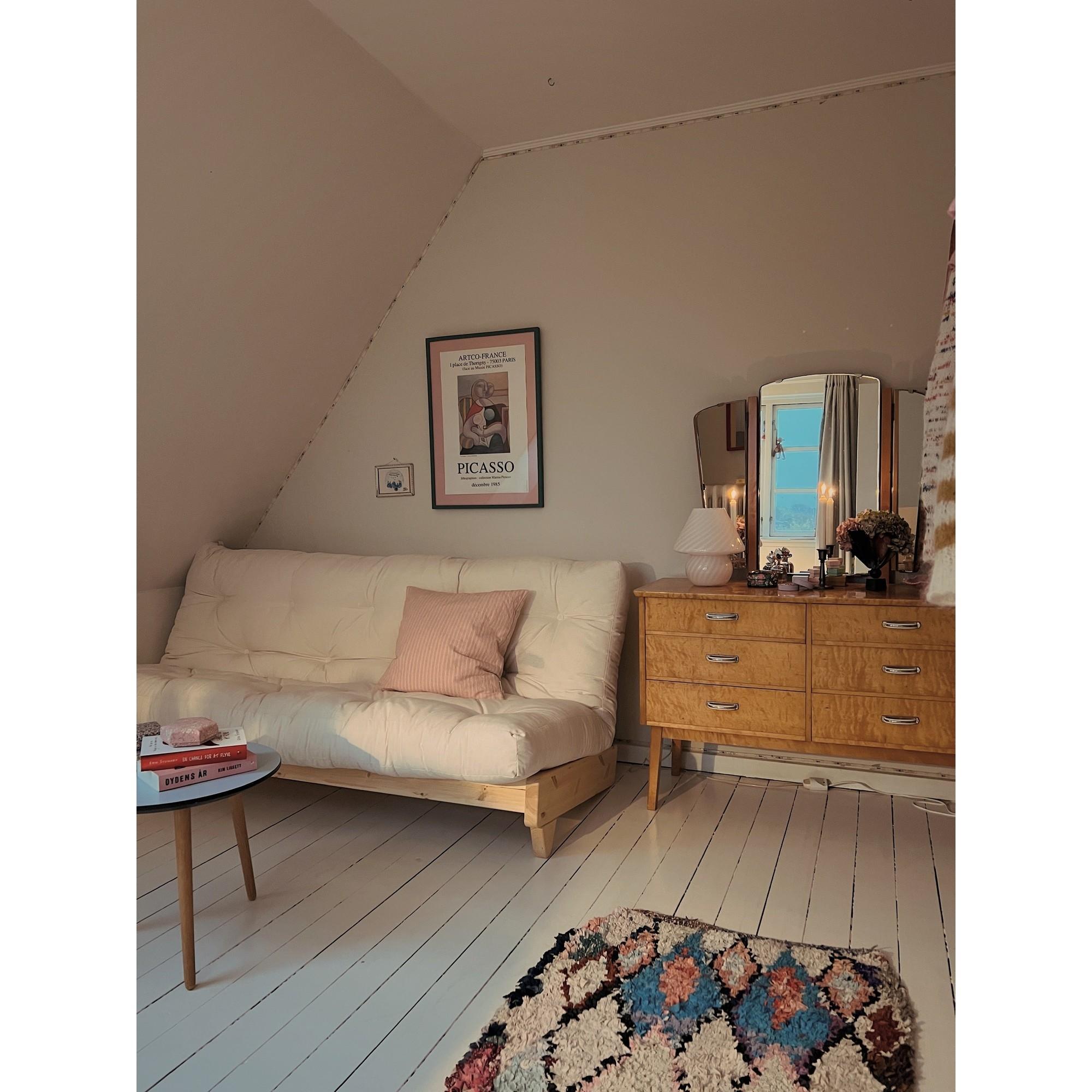 Le bois est un matériau naturel qui présente des variations et se patine avec le temps. Évitez tout contact avec des objets chauds, essuyez immédiatement les liquides renversés et resserrez régulièrement les vis. Les textiles peuvent être aspirés et nettoyés délicatement sans trempage.